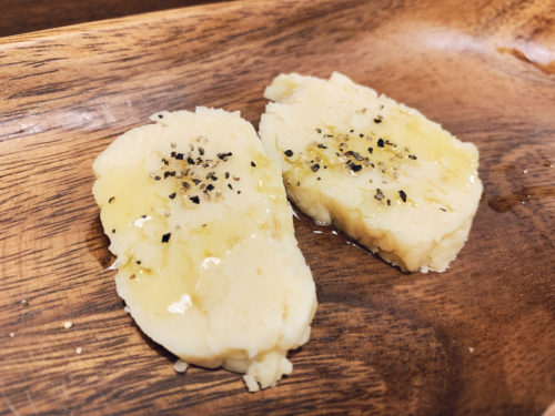 こちらはおつまみ用。オリーブオイルと塩、黒こしょう。スモークソルトやカレー塩などもいけそう。