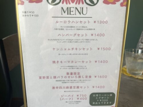 ルーロウハンセットやジーパイ(唐揚げ)などの本格台湾料理に、ハンバーグセットやヤンニョムチキンセット、焼きキーマカレーセットなどがあり、台湾ウーロン茶とデザートのセットも+500円でつけることができます。