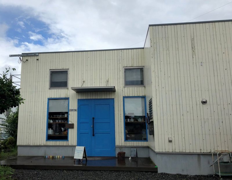 玉名市立願寺の大通りから一本入った住宅街の入り口。遠くからでも目立つ青い扉!