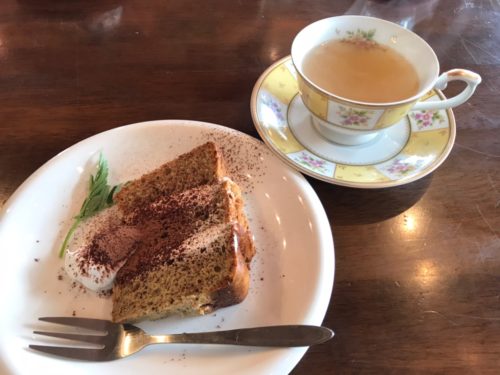 この日のデザートはティラミス風シフォンケーキで、ドリンクは自家製シロップのホットジンジャーをいただいてみました。シフォンケーキに使用されている卵は、餌になる大豆から無農薬!クリームは水切りヨーグルトと生クリームを混ぜたという、さっぱりとしたクリームで、こちらもおいしくて、至福のひとときが楽しめました。