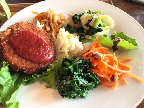 食べてみると、里芋コロッケは、まるでクリームコロッケのように、とろとろクリーミー!ちんげん菜と菜の花のごま和えは、さっぱりとさわやかな春の味で、人参のラぺもシャキッと美味!ベーコンまで自家製というジャーマンポテトも、ほろ苦いふきのとうみそも、もうなにもかもおいしくて、食べる度に幸せが波のように畳みかけてきます。