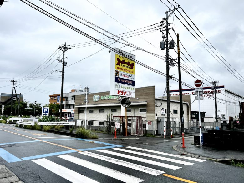 お店は少し奥に入ったところにあるので、右手にオレンジ色のマンションが見えたら反対側をご覧ください。こちらの砂利敷きの道を少し進んだ先にあります。