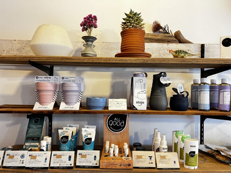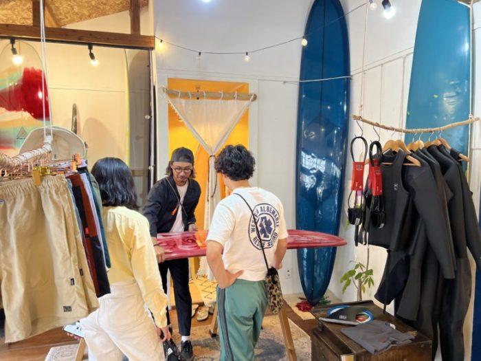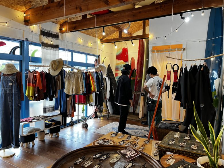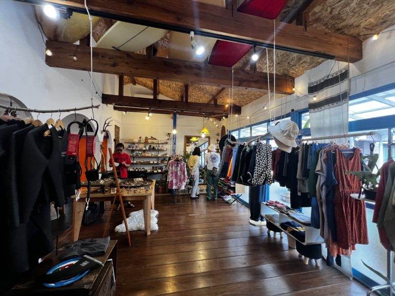 サーフィン関連商品やサスティナブルな商品が並ぶ店内