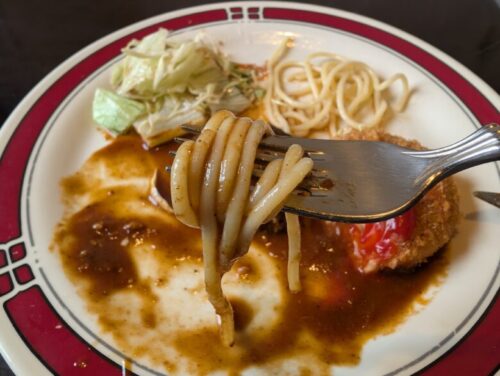 付け合わせのパスタも…デミグラスソースを絡めるのが正解だと思います!