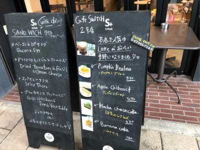 店の外にある看板をみると、サンドウィッチとドリンクのお得なセットや、店内で手作りしているスイーツのメニューがが掲載されています。。