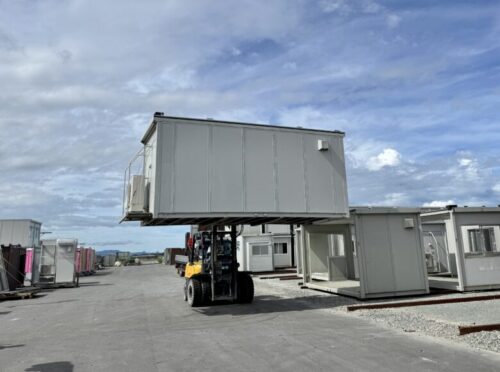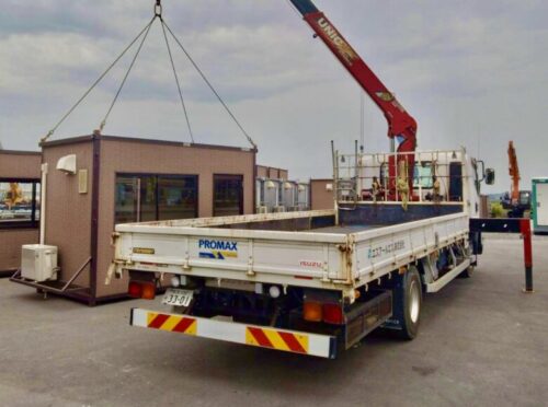 フォークリフトでヒョいと上げてクレーン付きトラックに乗せ移動させます。