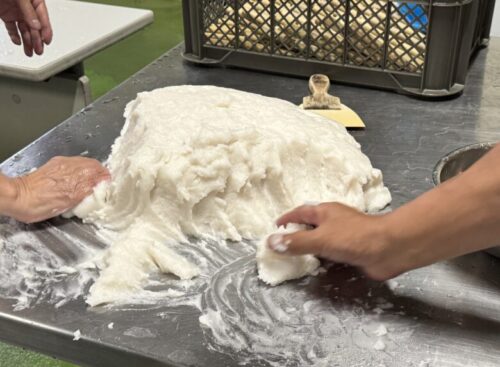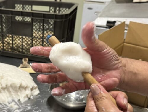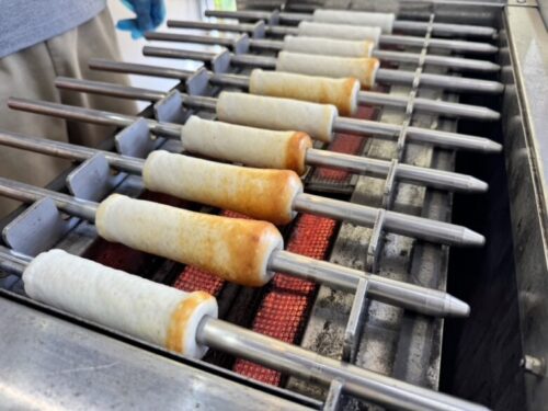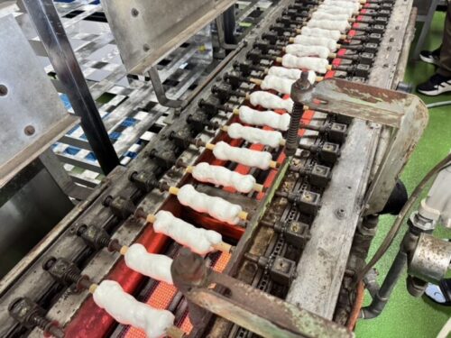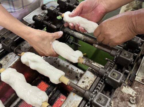 熱々のちくわが出来上がります。機械は時代によって変わったにせよ、この作業を170年以上続けてきた不動ちくわです。