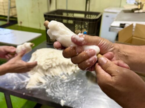 不動ちくわは、一個一個丁寧に竹筒に魚のすり身を手作業で巻いています。