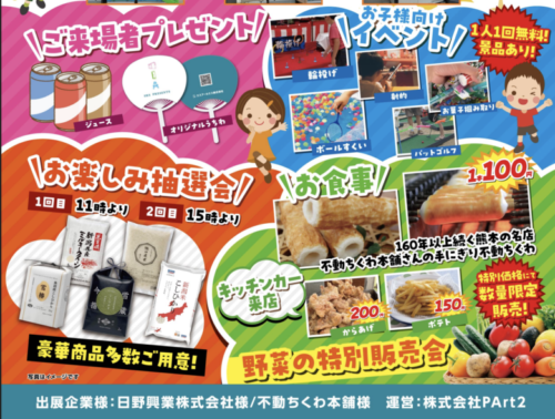 「そこで不動ちくわさんの焼きたてちくわ限定250本を100円で販売します!他にも数量限定ですが野菜の超お得販売会や子供たちも楽しめる射的や輪投げなどご用意しています」