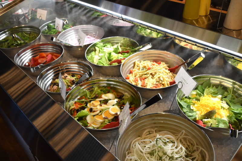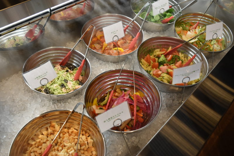 サラダバーには、カット野菜に加え、色鮮やかな野菜を使ったサラダやパスタなどの副菜が常時20種類が並びます! 全種類を制覇しようとすると、サラダバーだけでお腹いっぱいになりそうな予感が…。