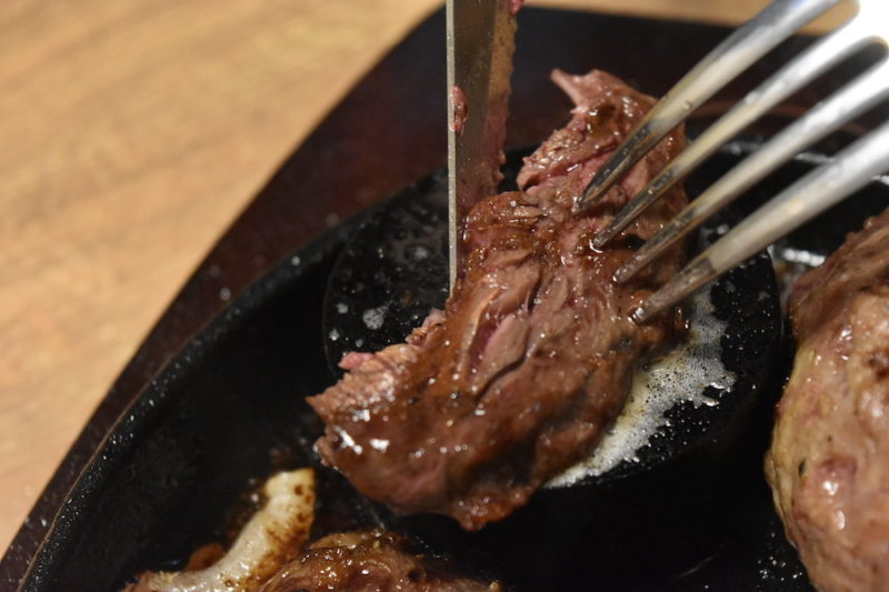 外側がカリッと焼き上げてあり、ナイフを入れるとホロっと崩れます。ハンバーグもレアの状態で提供されるので、焼き石で自分好みに焼き加減を調整してくださいね。