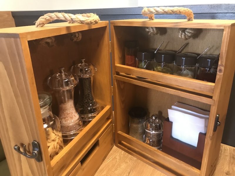 各テーブルには岩塩や胡椒、ニンニク、ワサビなども置かれています。