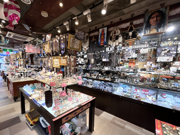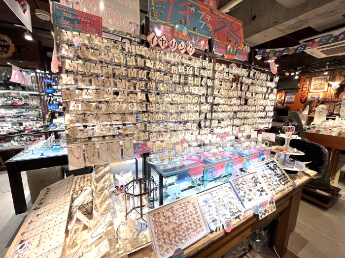 店舗に入って左側を見ると、アクセサリーが並ぶ棚や壁。