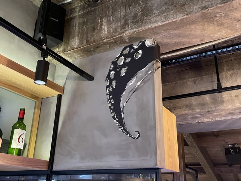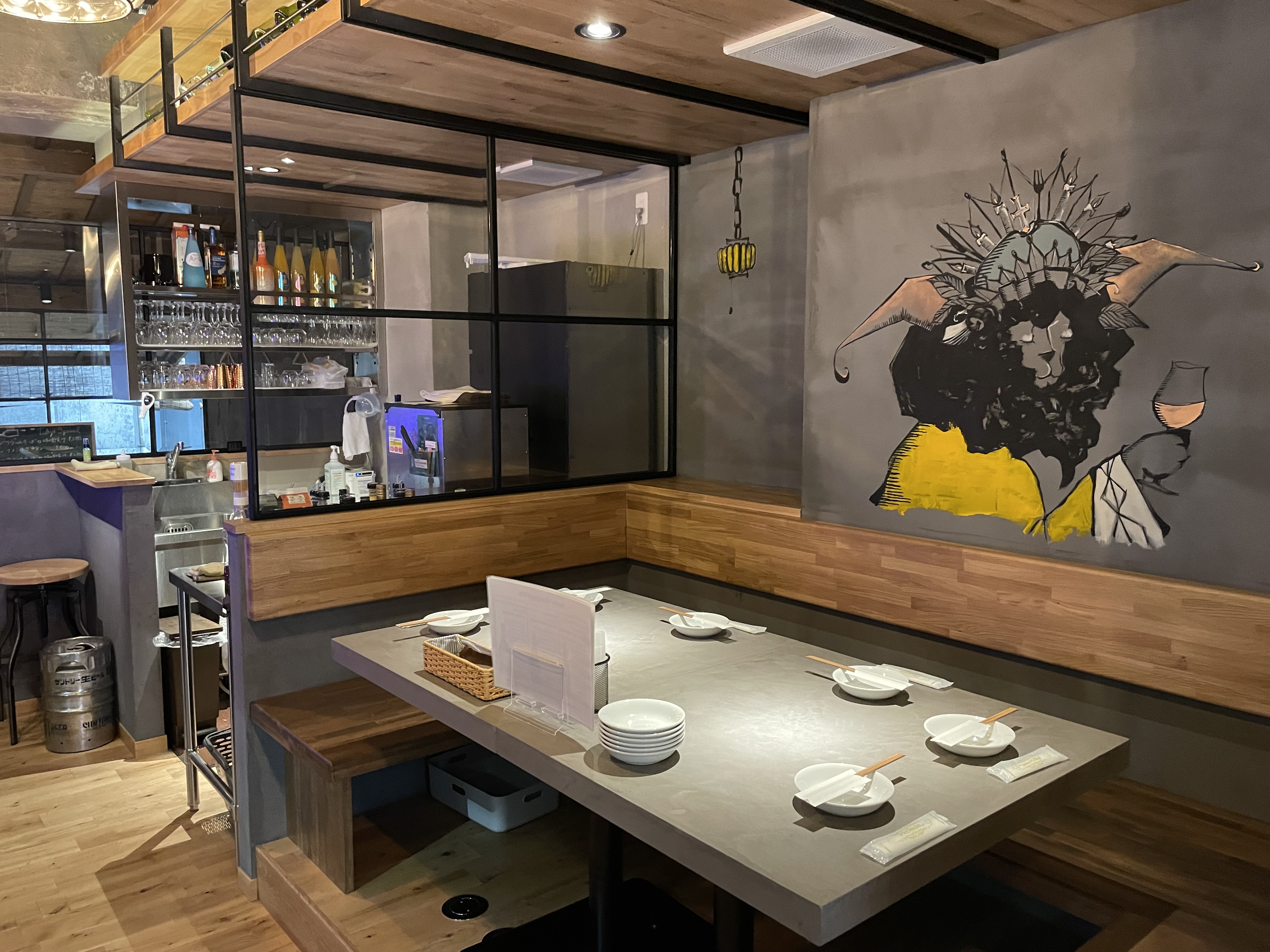 無数にトゲのある羊が描かれた壁。店内の絵は熊本の造形作家gajuさんが描かれたそうな。