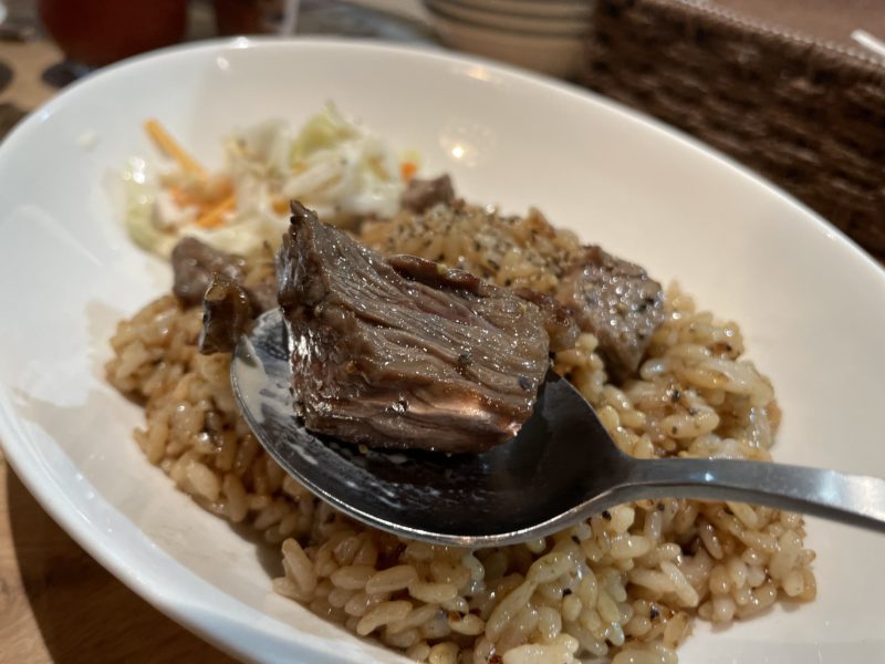 ゴロッと!ライスも濃いめのバーベキュー味。コレがトマト翠ジンサワーと相性バッチリ。