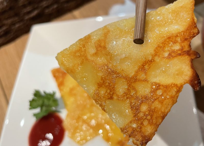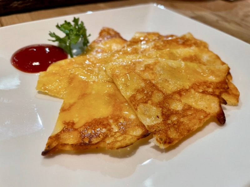 パリッと薄焼きのチーズ、塩味と香ばしさが絶妙で酒泥棒のハードルを余裕でクリア。お酒が進むわぁーコレ。