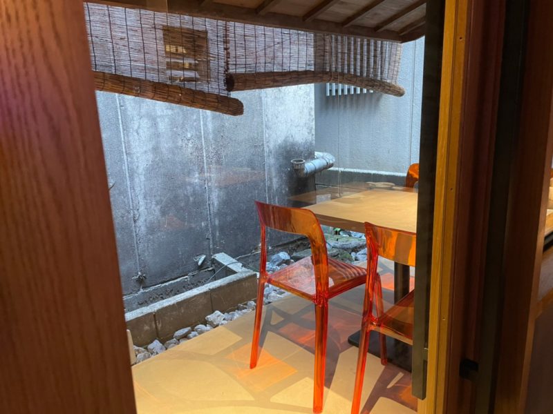 もっと奥にはテラス席があります。椅子がカワイイ。