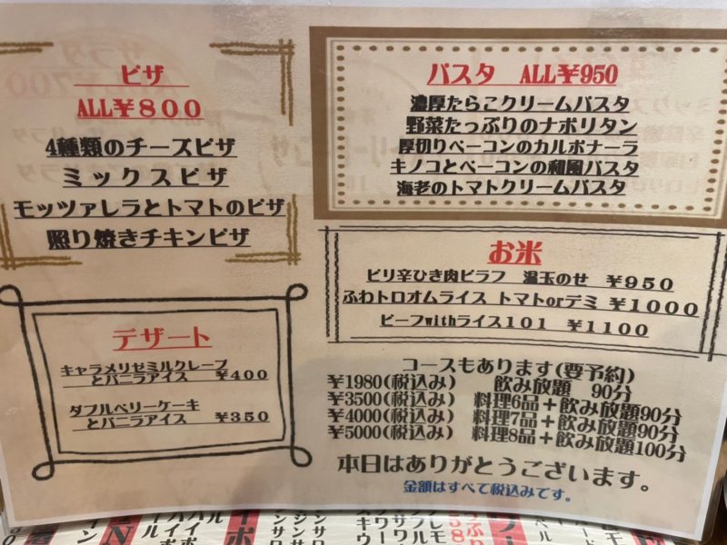 お酒飲みたい人へのおつまみメニューまで、無国籍風の洋食メニューが並びます。