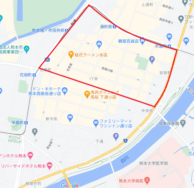 ここまでが下通りから見て白川方面の通りの名前。次は反対、熊本城方面を見てみましょう!