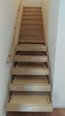 こちらも同じく、段差を利用しての収納スペースを確保。