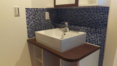 洗面台のタイルはご家族で決められた思い出たっぷりのカラー。