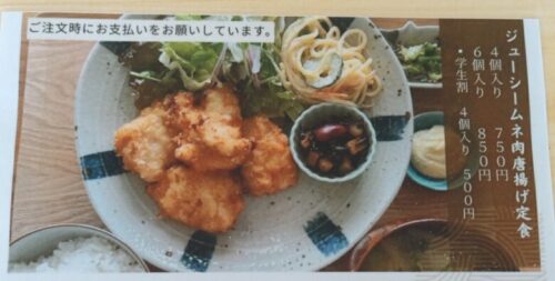 「ジューシームネ肉唐揚げ定食」は、学生(大学生まで)ならワンコインです。