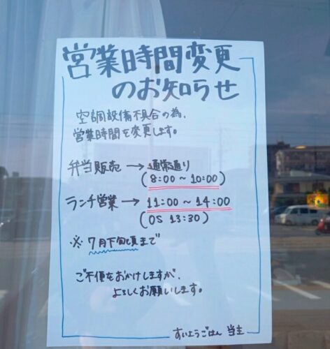 | 営業時間 | お弁当 8:00~10:00 ランチ 11:00~17:00(オーダーストップ16:30) 7月中は11:00~14:00(オーダーストップ13:30) |