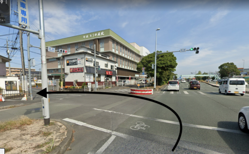 とうや病院すぎてすぐの交差点(友添歩道橋が目印)を右折。