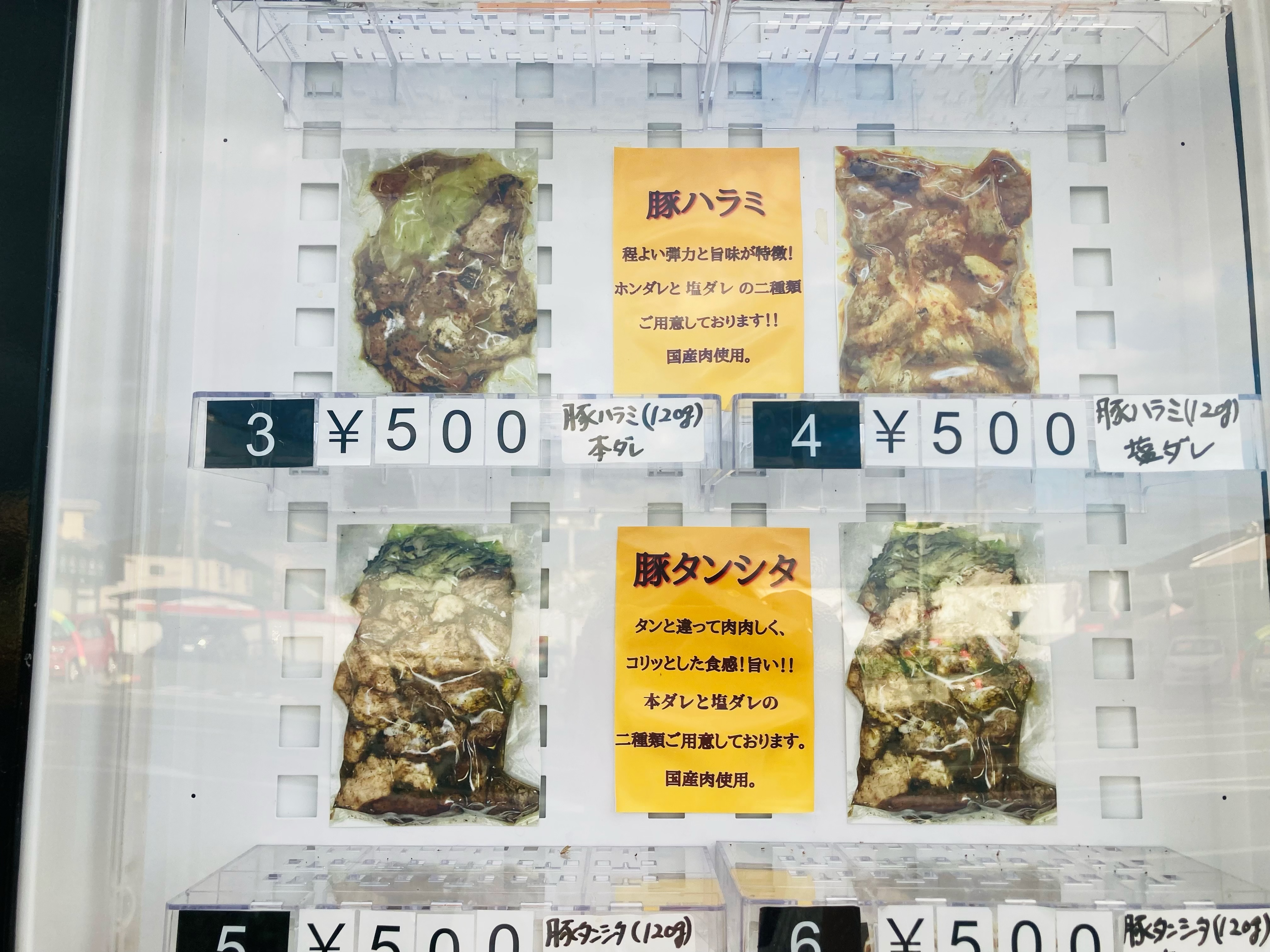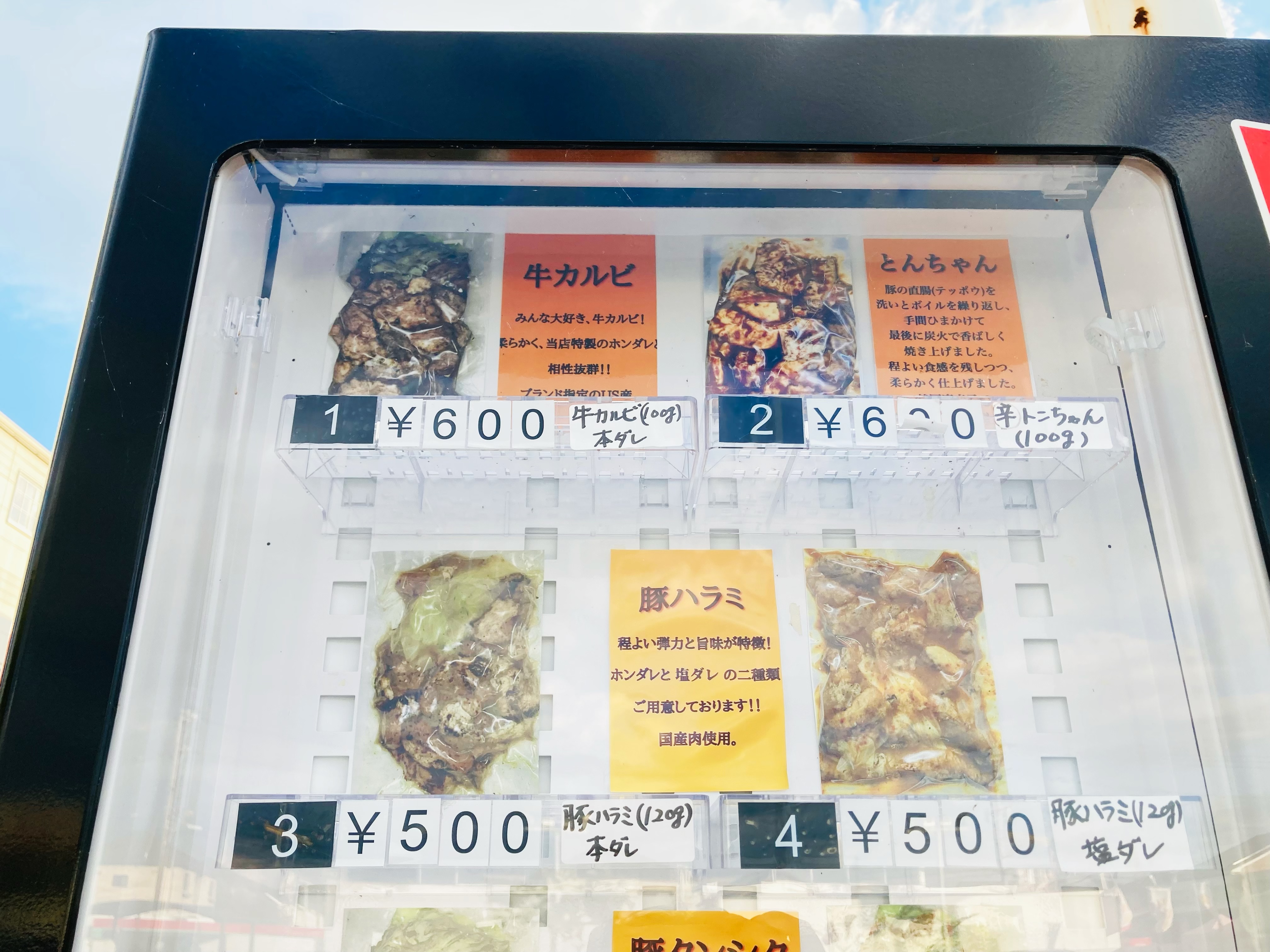 自動販売機には、焼肉メニューが。定番人気のカルビに、珍しい部位のとんちゃん(直腸)。流石焼肉屋さんという品揃え。