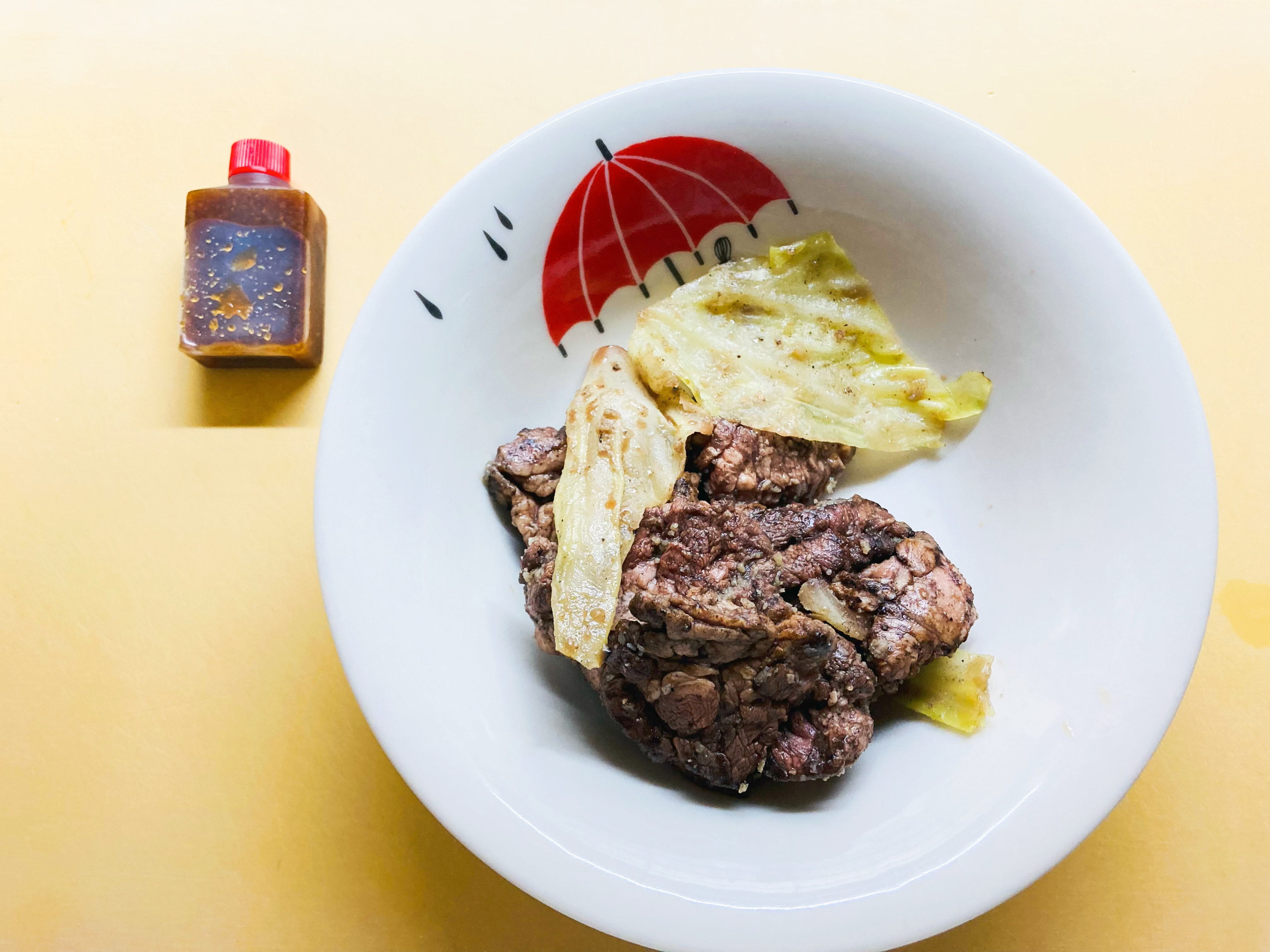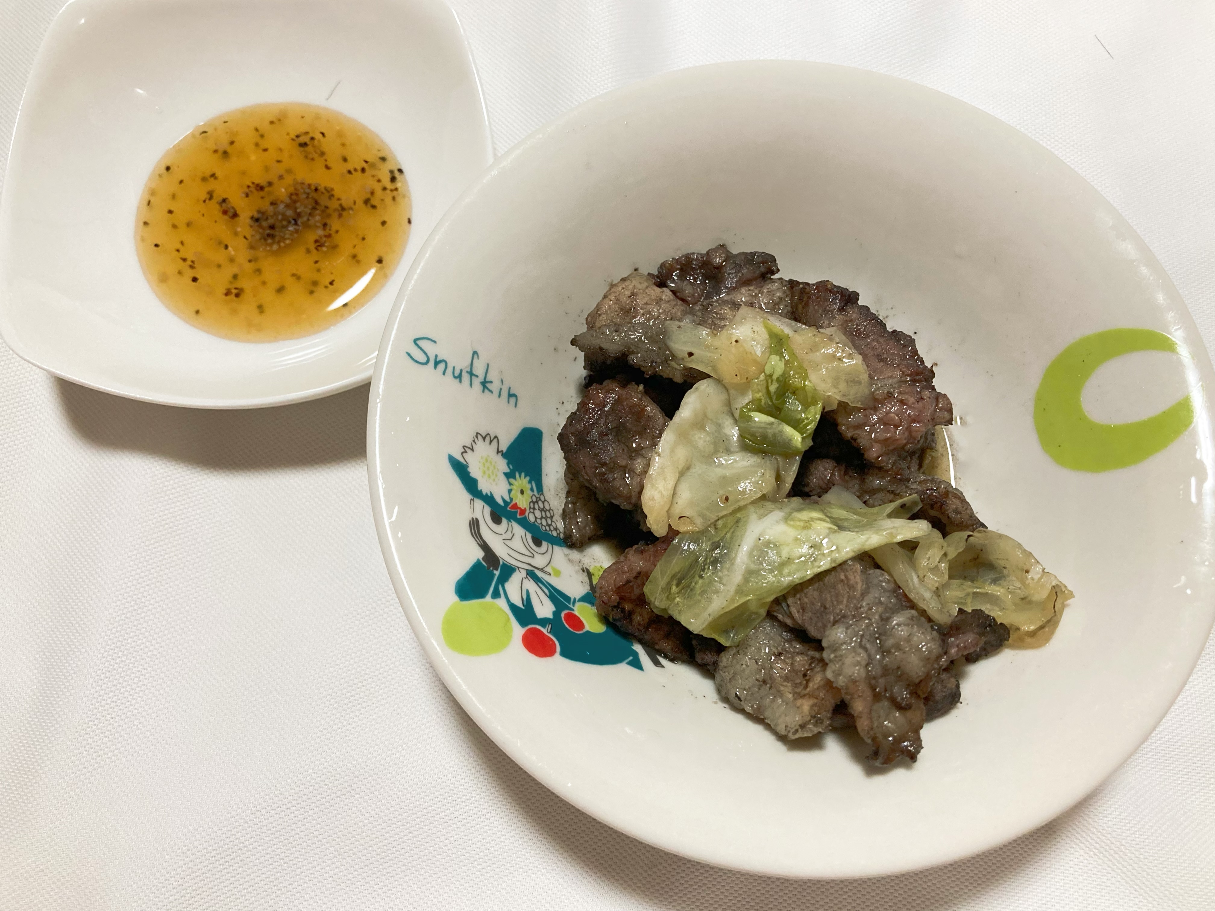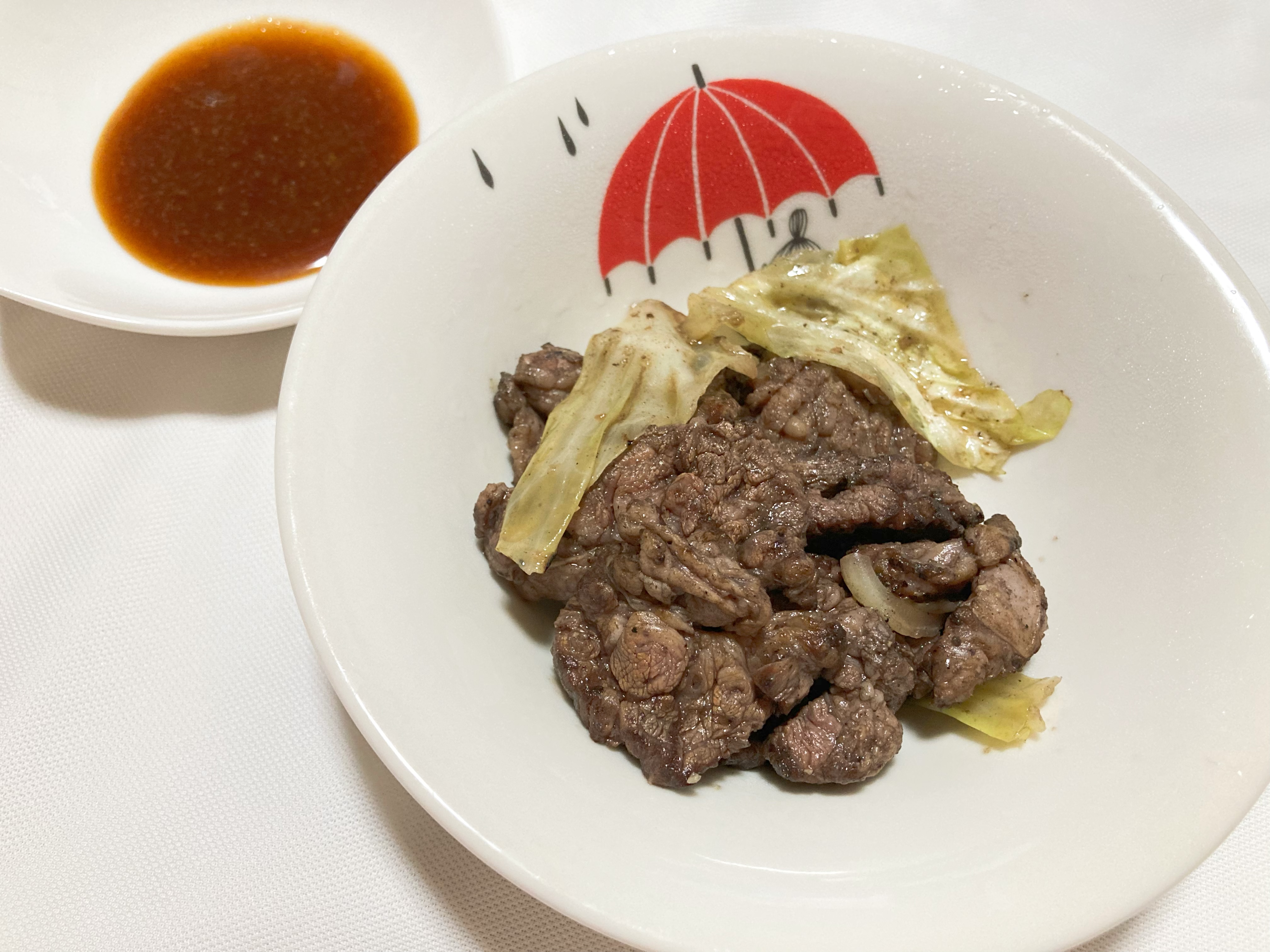 まずは、牛カルビから頂きます。炭火で焼き上げられていて、お店の焼肉そのまんま!本当に焼肉屋さんで食事しているみたいです。びっくりしたのはキャベツがシャキシャキしていること。これは嬉しい。