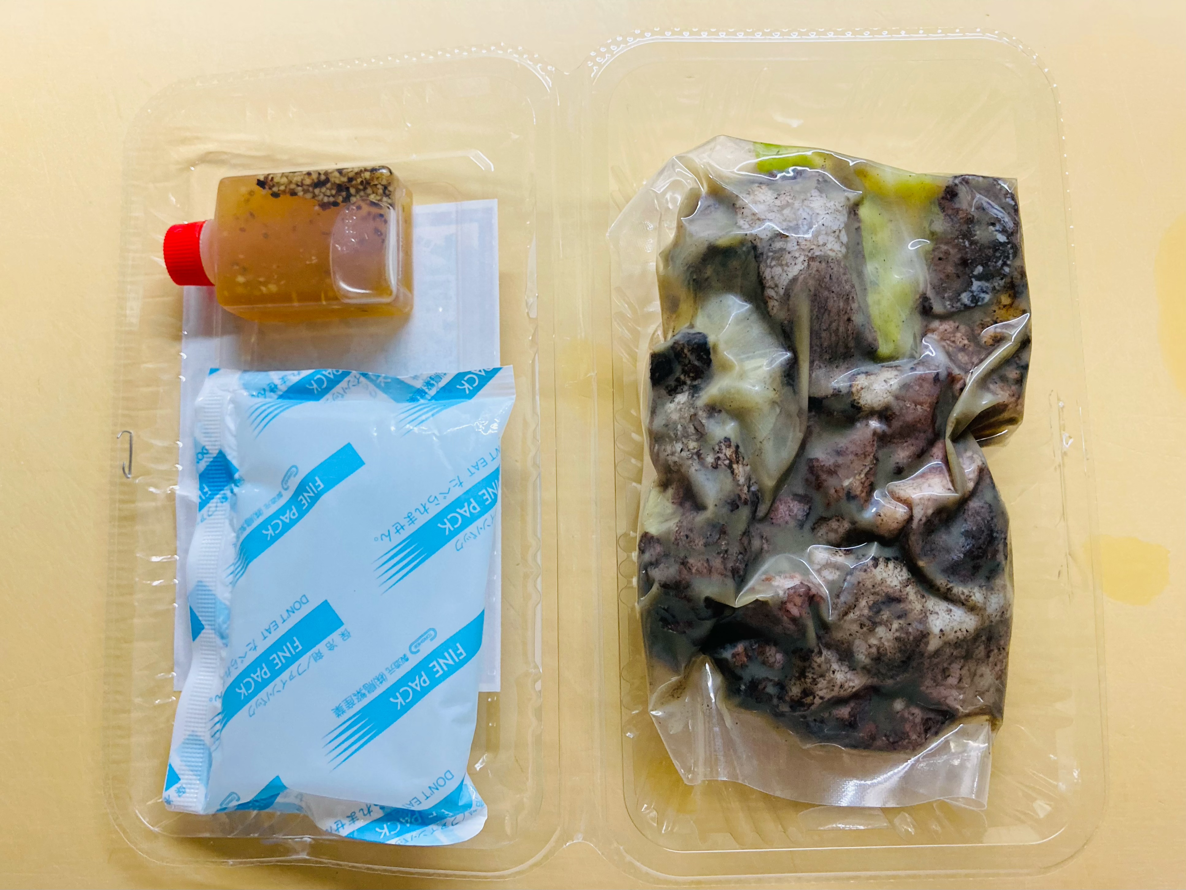 パックの中にはお肉、キャベツに加えて、別添えのタレに保冷剤。気遣いが伺える内容。