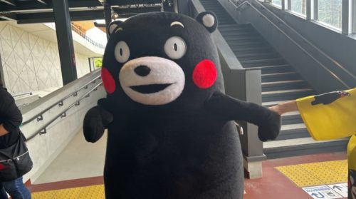 立野駅でお出迎えしてくれた、くま…はくまでもくまモンパイセンがずんずんやってきてハイタッチしてくれました。