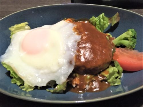 ランチメニューは、カフェ丼やパスタ、ピザ、シチューなど多数あり、オーナーさんが好きな一品というロコモコをチョイス。