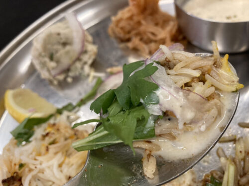 - スパイスで味付けされたバスマティライス&パクチー、スライス玉ねぎ