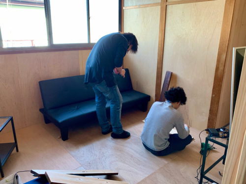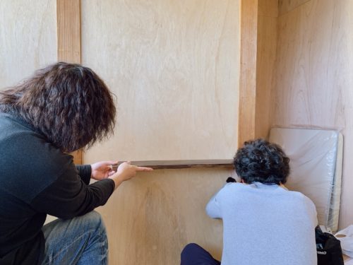 乾くのを待って翌日。早朝に私しゅんとりようで事務所へ集合し、キャットウォーク造りの続きへ。