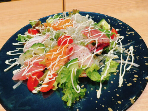 まずはサラダ!と思いオーダーしたのは海鮮カルパッチョ。お刺身とお野菜のボリュームがちょうど同じくらいだったので、罪悪感なくワシワシと食べられます。