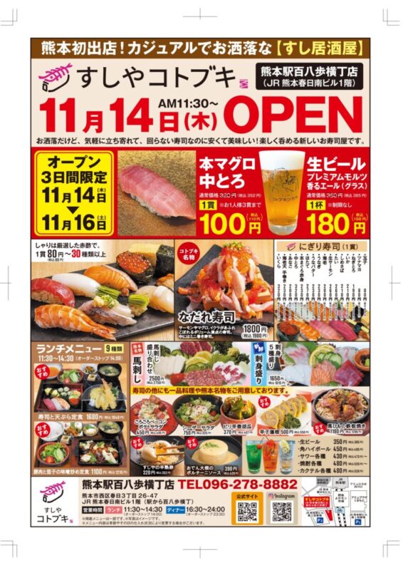 今回ご紹介する「すしやコトブキ」は、熊本駅の百八歩横丁に11月14日にオープン。
