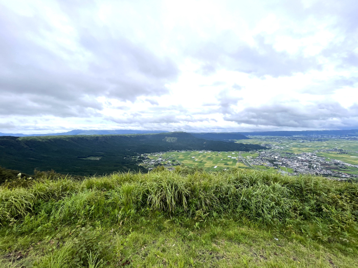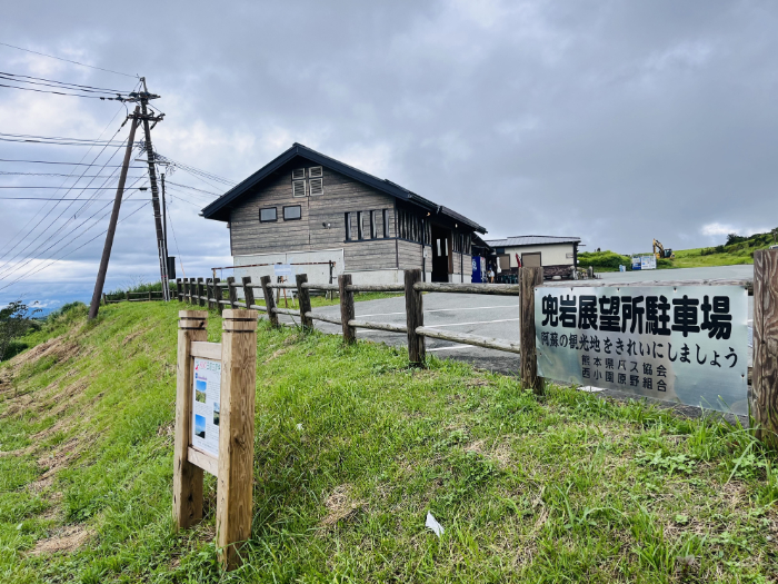 「すすきの迷路」があるのは、阿蘇市西小園のかぶと岩展望所のすぐ近く。まずはこちらを目指していきましょう。かぶと岩展望所向かいの駐車場にはトイレがあるので、休憩もできて便利です。
