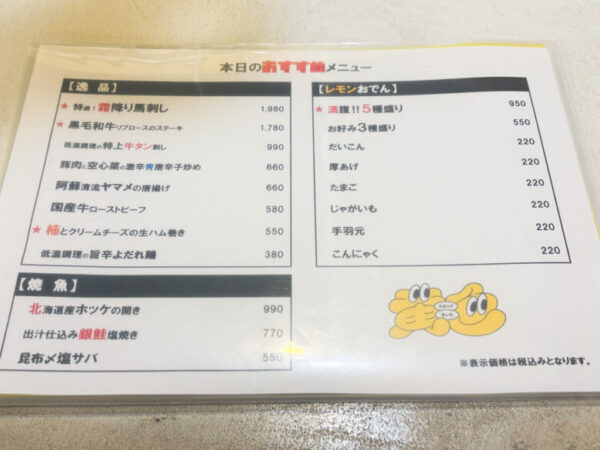 刺身から揚げもの、おつまみにおでん。ふらっと立ち寄るにはかなり豪華なラインナップ。