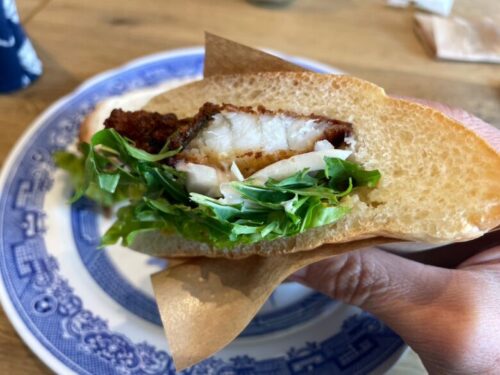 メインのサンドイッチは、お友達とのシェアも可能ということで、豚肉のサンドイッチ&お魚のサンドイッチのハーフ&ハーフにしてみました。