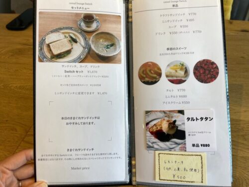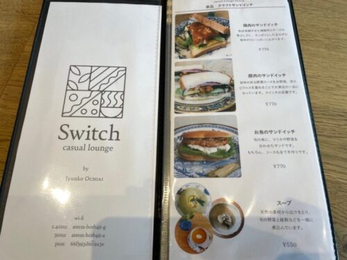 サンドイッチにスープ、ドリンクが付くSwitchセットが1,670円で、スイーツやドリンクも用意されています。