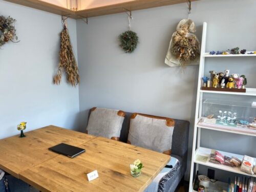ゆったりとくつろげるソファー席もあり、ドライフラワーのスワッグたちも素敵です。