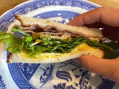 豚肉のサンドイッチも、豚肉にレタス、薄焼き卵など、たくさんの具材が入っていて、しっかり食べ応えがあります。