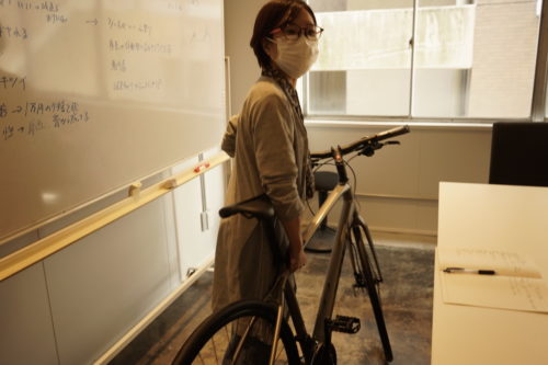 奥村店長徳田さん、私が持ってきたクロスバイクを抱えてもらえますか?