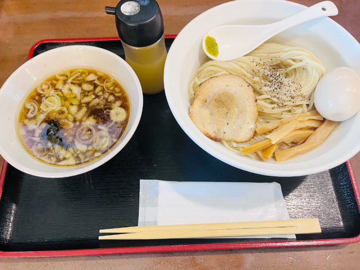 今回は、人気ナンバーワンだという『あご出汁特製つけそば』に、おすすめトッピングの半熟煮玉子をお願いしました。