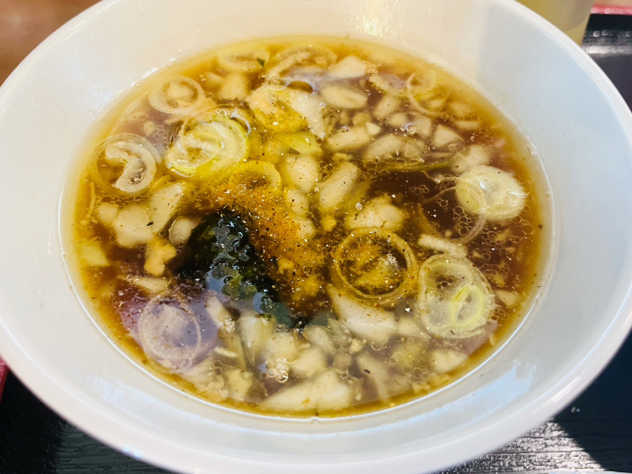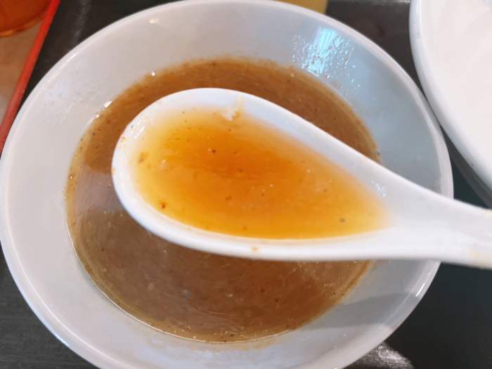 さらりとしたスープの完成。柚子胡椒で味変もしていたので、あご出汁の旨味そのままにさっぱりしたスープに。つけ汁に入っているネギやタマネギがシャキシャキとしていて、これがまた美味しい。ごくごく飲めちゃいます。