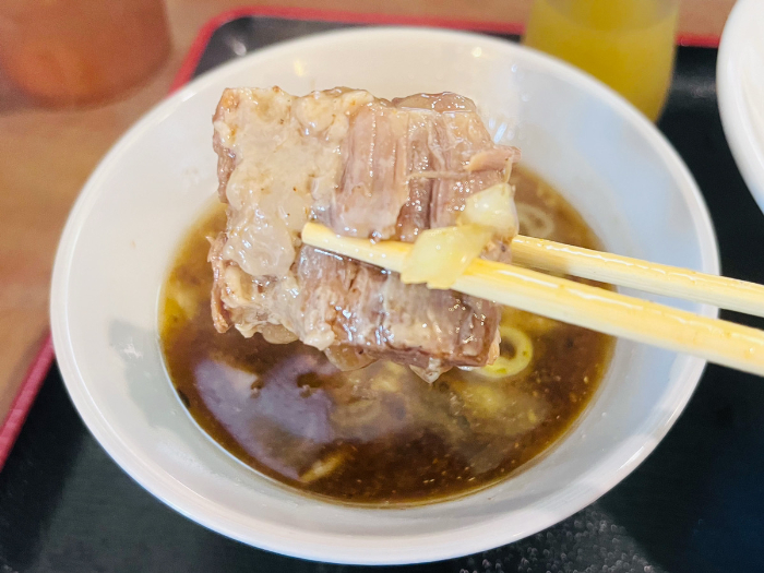 何か入っているなと思って取り出すと、つけ汁の中には大きな豚の軟骨も入っています。箸でやっと持ち上げられるくらいホロホロ。