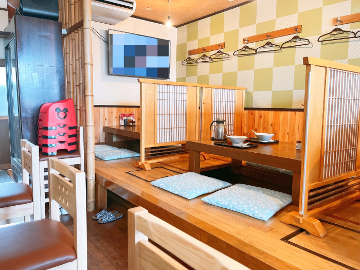 店内は居酒屋みたいな雰囲気。和の空間が広がります。店内右側は掘りごたつ席。お子様用のイスも用意されているので、ファミリーも来店されていました。