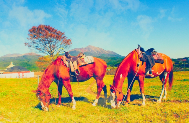 阿蘇山を眺めながら優雅に乗馬ができる施設。