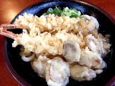 ごぼう天に海老天トッピング。ごぼう天はぶつ切りタイプで噛み応えがしっかりあるタイプです。